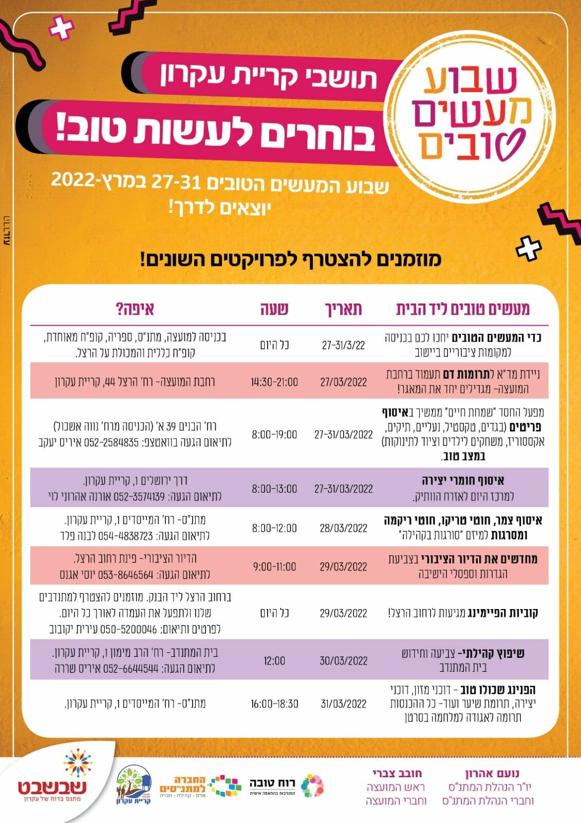 המועצה המקומית קריית עקרון ומתנ"ס שבשבט מזמינים את התושבים לקחת חלק בשלל פעילויות יום המעשים הטובים. התושבים מוזמנים לתרום לקהילה ולעשות טוב למען האחר במגוון אירועים קהילתיים כגון: תרומות דם, שיפוץ בית המתנדב, פעילות למרכז יום לקשיש ועוד