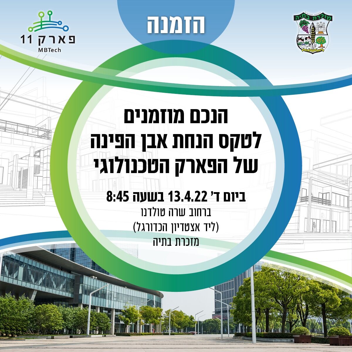הפארק הטכנולוגי של מזכרת בתיה יוצא לדרך! ביום רביעי 13.4 יתקיים טקס הנחת אבן הפינה לפארק הטכנולוגי ליד אצטדיון הכדורגל