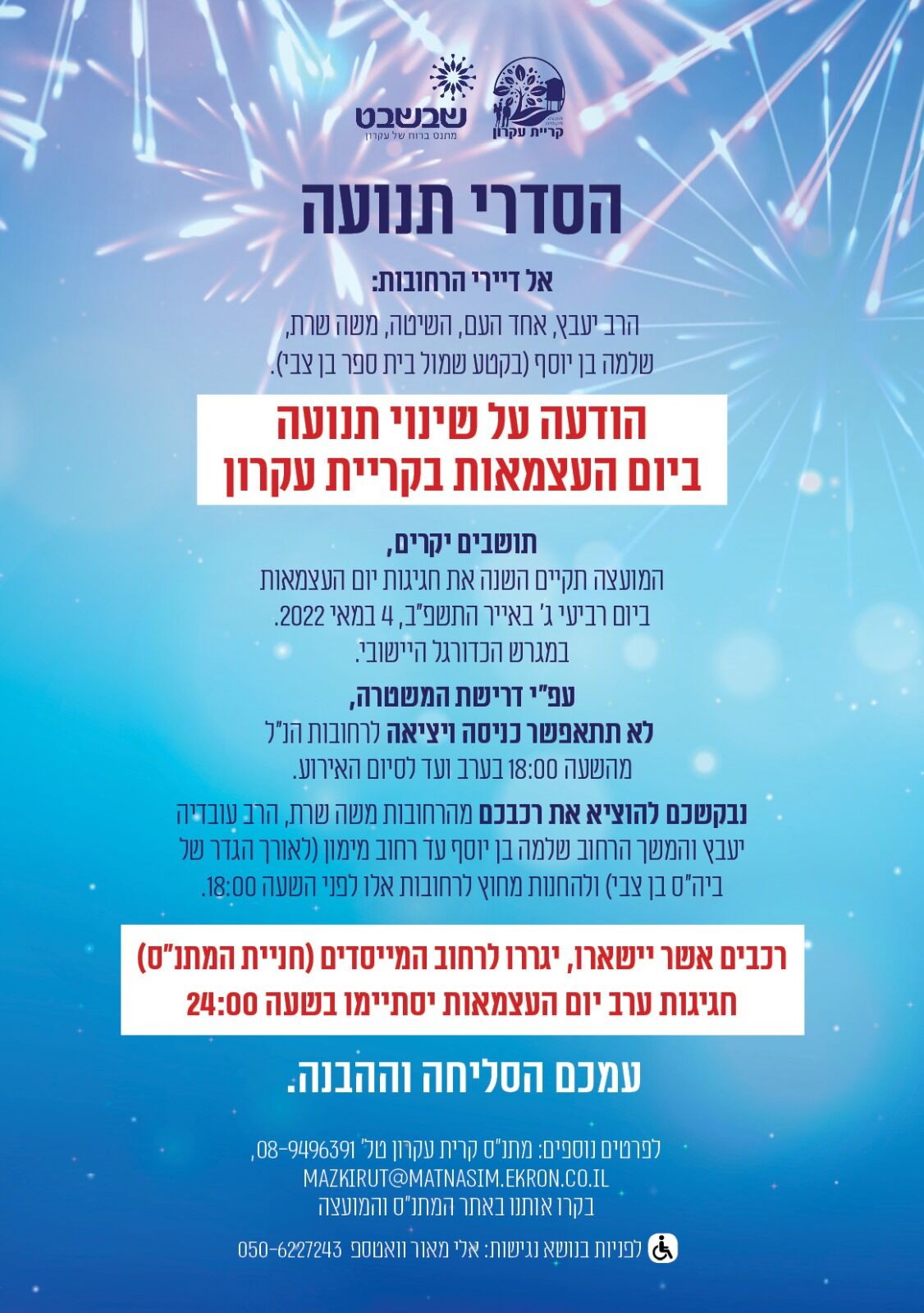 המועצה המקומית קריית עקרון מודיעה על שינויים בהסדרי התנועה שיחולו בעקבות אירועי יום העצמאות רביעי 4.5.