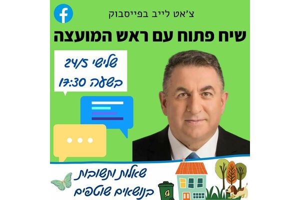 ראש המועצה יקיים היום שלישי 24.5, בשעה 17:30, שיח רשת פתוח, בו תוכלו להעלות את כל השאלות שלכם בנושאים שעל סדר היום של המועצה.