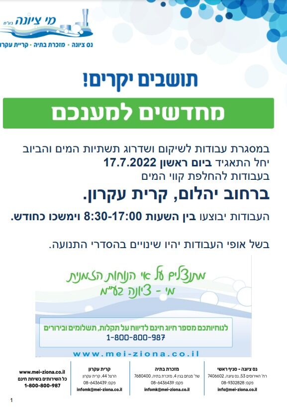 תאגיד המים מי ציונה ממשיך בעבודות לשיקום ושדרוג תשתיות המים והביוב בקריית עקרון. ביום ראשון 17.7 יחלו עבודות להחלפת קווי המים ברחוב היהלום אשר יתבצעו מדי יום בין השעות 8:30-17:00 למשך כחודש. בעקבות העבודות צפויים להיות באזור שינויים בהסדרי התנועה.
