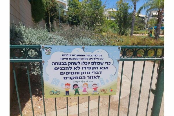 מועצת מזכרת בתיה הציבה שלטים הקוראים לתושבי להימנע להכניס דברי מזון וחטיפים לאזור המשחקים בגינות דבורה עומר, אגוז ומיכאל על מנת להתחשב ולשמור על ילדים עם אלרגיה מסכנת חיים