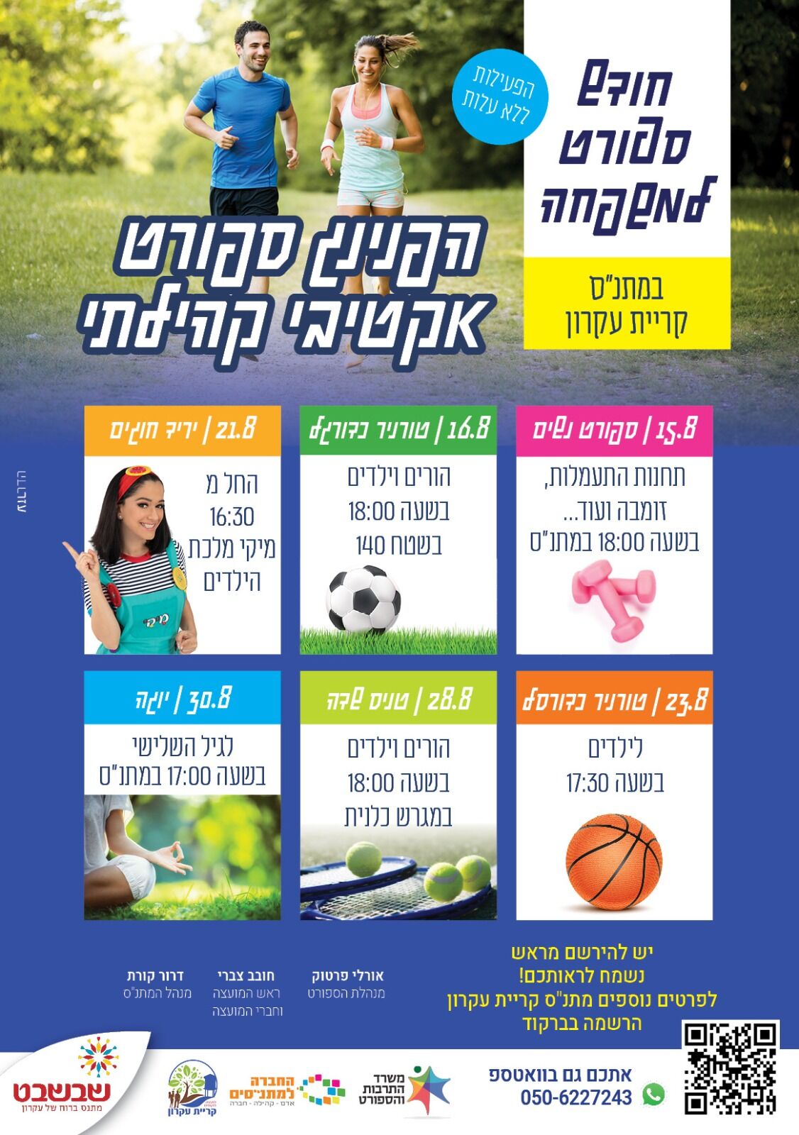 החל מיום שני 15.8 יפתח בקריית עקרון הפנינג ספורט קהילתי הכולל הופעה של כוכבת הילדים מיקי, התעמלות, זומבה, טורניר כדורגל, כדורסל, יוגה ועוד