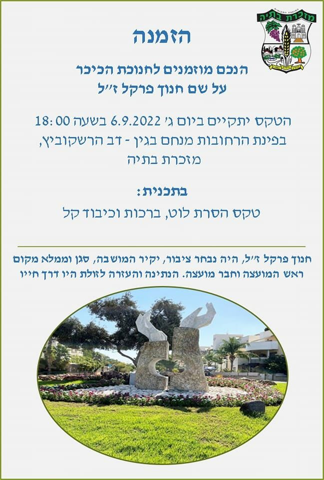 המועצה המקומית מזכרת בתיה מזמינה את התושבים לטקס חנוכת הכיכר על שם חנוך פרקל ז"ל, שיתקיים היום, שלישי, 6.9 בשעה 18:00, בפינת הרחובות מנחם בגין - הרשקוביץ.