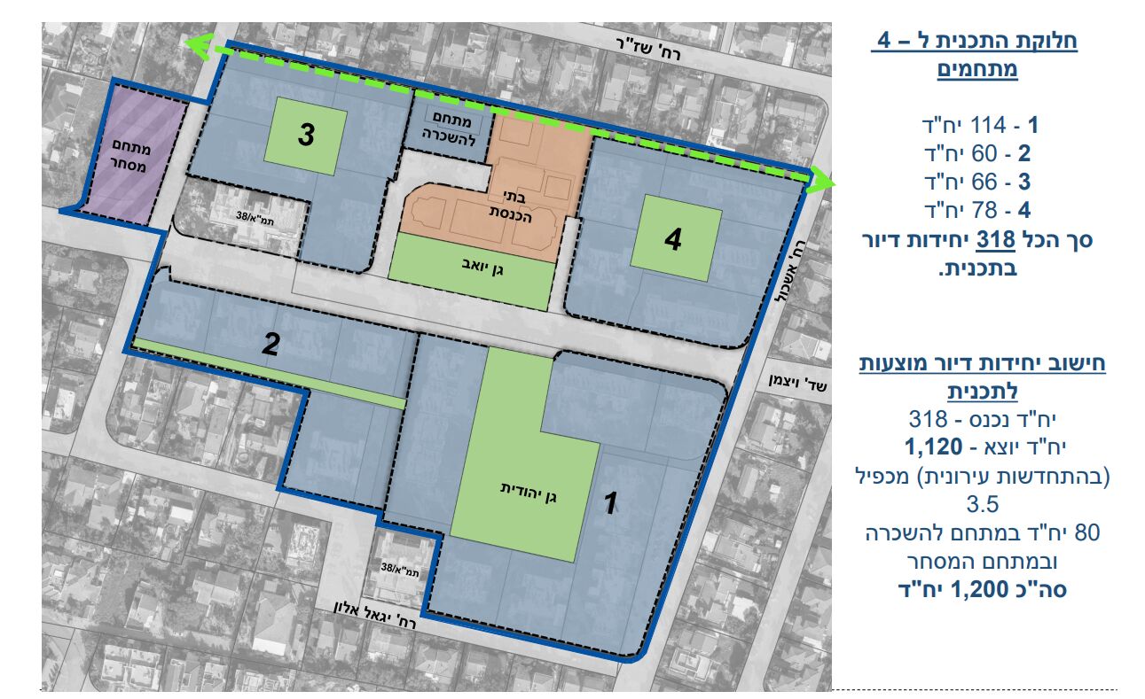 התוכנית מחולקת ל4 מתחמים בהם יוקמו יחידות הדיור על פי החלוקה הבאה: