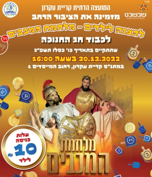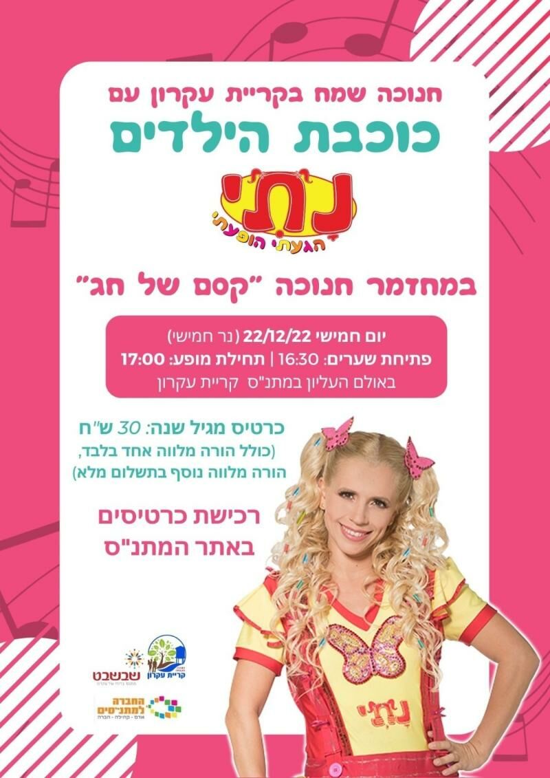 מדריך אירועי חנוכה בקריית עקרון! כוכבת הילדים נתי הגעתי הופעתי, הצגת הילדים מלחמת המכבים, מסיבת הדלקת נרות מוזיקלית עם חיה נייס ועמנואל מודריק ועוד והפתעות