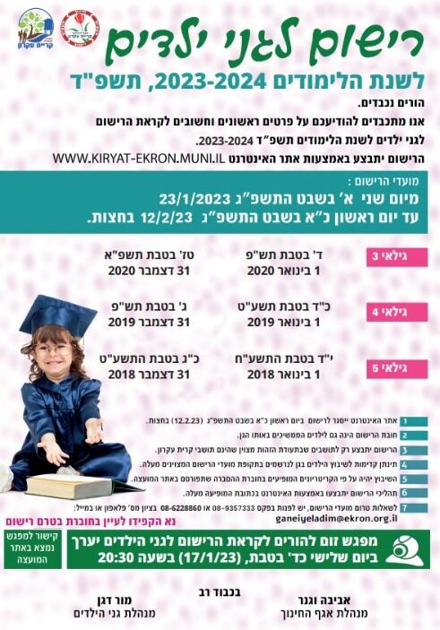 לקראת פתיחת ההרשמה לגני הילדים וכיתות א בקריית עקרון מחר (שני 9.1) יתקיים יום פתוח להורים בבית ספר בן צבי ביום שישי 20.1 יתקיים באוהל מאיר