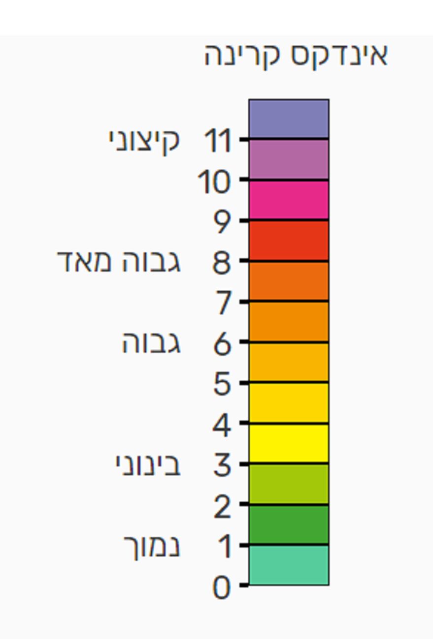 בנוסף לתחזית מזג האויר השירות המטאורולוגי מציג מדי יום תחזית שעתית לאינדקס הקרינה. אינדקס קרינה אולטרה סגולה הינו מדד מחושב שמבטא את רמת הסיכון לחשיפת העור לקרינה אולטרה-סגולה (UV) המגיעה מהשמש. על פי המדד ניתן לראות מהן השעות הבטוחות לשהות בשמש בהן רמות הסיכון לחשיפה לקרינת השמש נמוכה (ירוק אין חשש) גבוהה/קיצונית (צבע סגול, אין להימצא בשמש ללא הגנה).