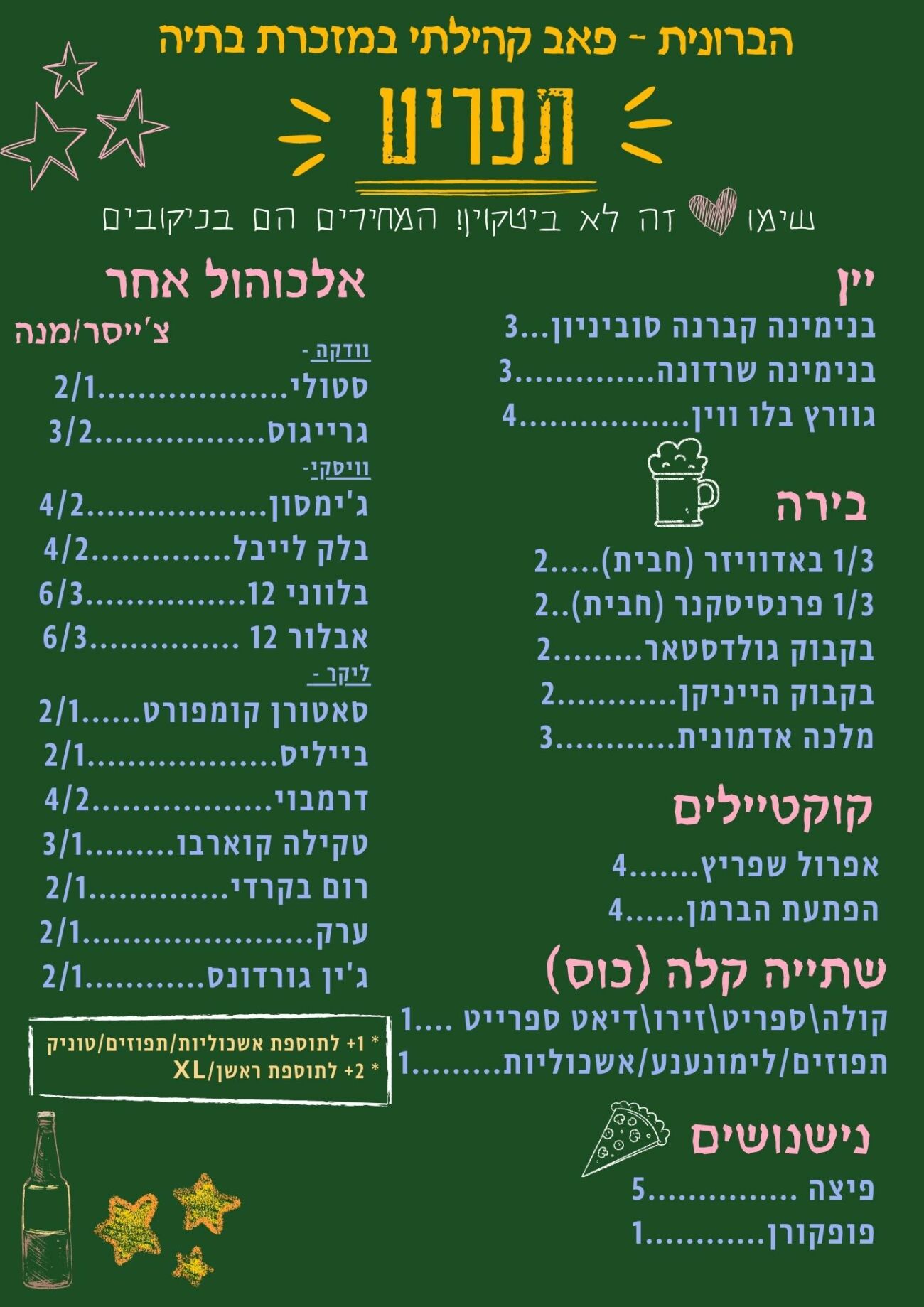 שימו לב לא תתאפשר רכישה במזומן/כרטיס אשראי אלא באמצעות הכרטיסייה: כל מוצר בפאב הוא שווה מספר ניקובים כך למשל יין עולה 3-4 ניקובים.