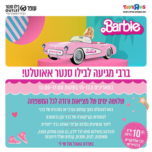 לאור הצלחת הסרט ברבי בארץ ובעולם, מתחם הקניות והבילוי עופר בילו סנטר, מקבוצת קניוני עופר, בשיתוף רשת טויס אר אס, יפתחו מתחם ברבי שיפעל 3 ימים – לכל המשפחה.