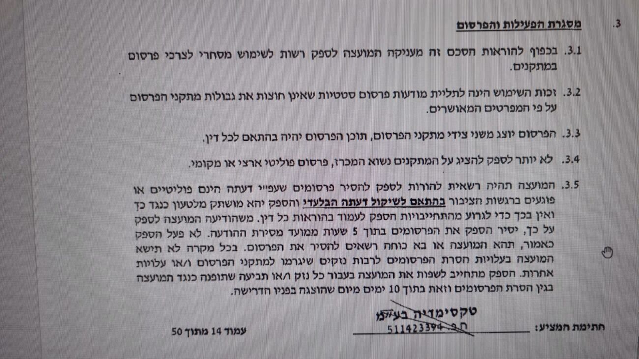 "בחוזה נקבע באופן חדש משמעי (סעיף 3.4) כי במסגרת ההתקשרות, אין לחברה כל אישור לפרסם שילוט פוליטי- ארצי או מקומי.