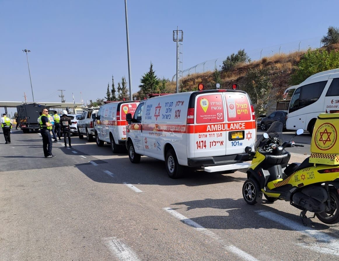 חובשים ופראמדיקים של מד"א העניקו טיפול רפואי ופינו לבתי החולים שערי צדק, שיבא בתל השומר ושמיר-אסף הרופא, סה"כ 6 פצועים בהם: צעיר כבן 20 במצב אנוש עם חבלה רב מערכתית תוך פעולות החייאה, ששבית החולים נקבע מותו, צעיר כבן 20 במצב קשה, בהכרה, עם חבלה רב מערכתית, צעיר כבן 20 במצב קל עם חבלות בגפיים, נער כבן 15 (פלסטיני) במצב קל עם חבלה בגפיים. המחבל שברח מהמקום התנגש ברכב פרטי מאחור סמוך לצומת מכבים, גבר ואישה כבני 25 ששהו ברכב פונו במצב קל עם חבלות בגב.