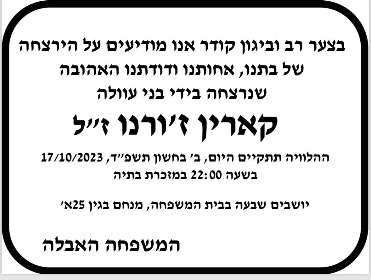 ההלוויה תתקיים היום שלישי 17.10 בשעה 22:00 בבית העלמין מזכרת בתיה