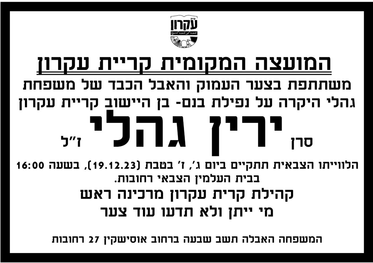 אנו כואבים עם משפחת גהלי את האובדן הכבד של ירין הי״ד, משתתפים בצערה הגדול, ושולחים תנחומים מעומק הלב, בשם כל תושבי רחובות״