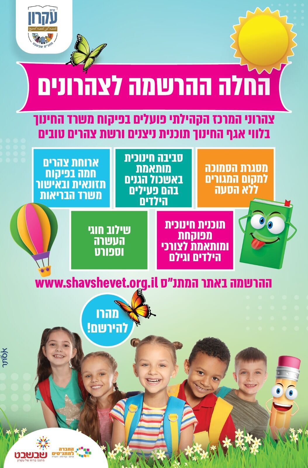 נוסף תיפתח ב11.1.24 ההרשמה לצהרוני מתנ"ס שבשבט שיתבצעו דרך אתר המתנ"ס.