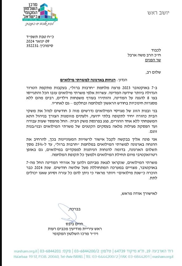 יו"ר מרכז השלטון המקומי, חיים ביבס פנה אל שר הפנים על מנת לאפשר הקלות בארנונה למשפחות המילואים הנלחמים בצפון ובדרום. כבר 3 חודשים בני ובנות הזוג של משרתי המילואים נשארים מאחור ונאלצים להתמודד עם ניהול משק הבית, טיפול בילדים, הבאת פרנסה לבית שנפגעת בעקבות הפסד שעות עבודה, חופשים וטיפול בבתי העסק של בני הזוג שנמצאים בחזית.
