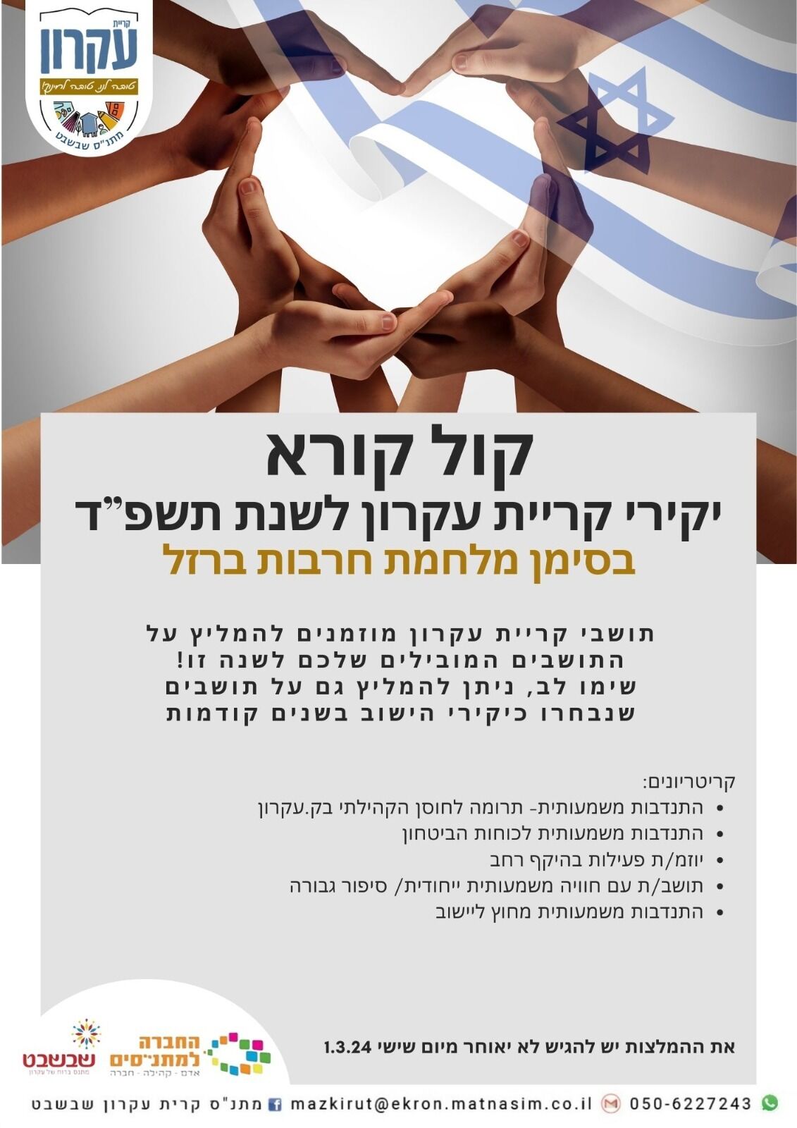 מי יהיו יקירי קריית עקרון לשנת 2024? המועצה המקומית מזמינה את התושבים להגיש הצעות לתושבים המתאימים לקבל את אות יקירי עקרון שיעמוד בסימן מלחמת חרבות ברזל- המלצות יתקבלו עד ליום שישי 1.3.24