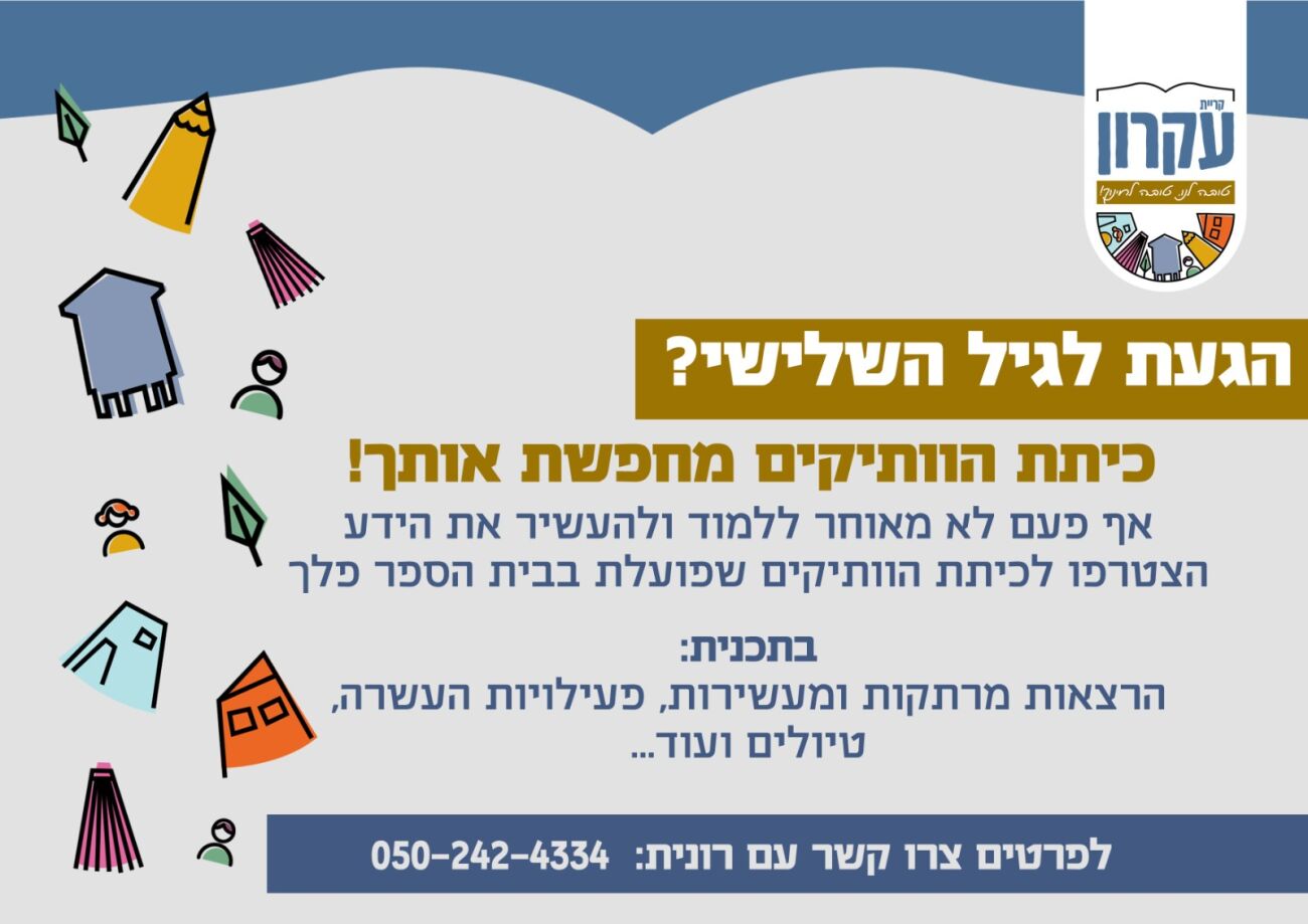 אולפנת פלך מזמינה את בני הגיל השלישי בקריית עקרון להצטרף לכיתת הותיקים של בית הספר