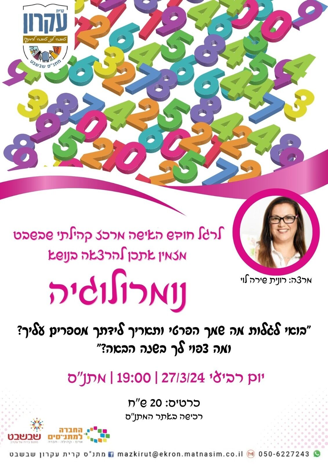 יום רביעי 27.3.24 הרצאה בנושא נומרולוגיה עם רונית לוי מה שמך ותאריך הלידה מספרים עלייך ומה צפוי לך בשנה הקרובה