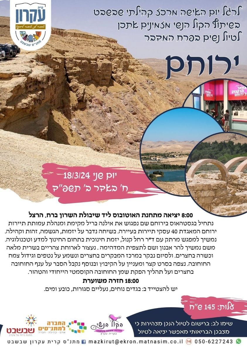 יום שני 18.3.24 טיול נשים לירוחם פרח המדבר בעקבות נשים משפיעות. בשעות 8:00-18:00, עלות: 145 ש"ח. הטיול לנשים בלבד.