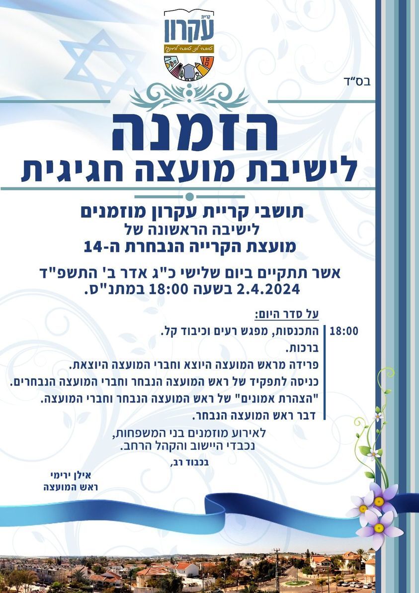 ביום שלישי הקרוב 2.4 עתידה להתכנס לראשונה מועצת קריית עקרון החדשה (ה14) בראשות ראש המועצה, אילן ירימי. ישיבת המועצה החגיגית עתידה להתקיים במתנ"ס שבשבט בשעה 18:00 בו יצהירו חברי המועצה הנכנסת אמונים וכן יתקיים טקס פרידה מראש המועצה היוצא, חובב צברי וחברי המועצה היוצאת.