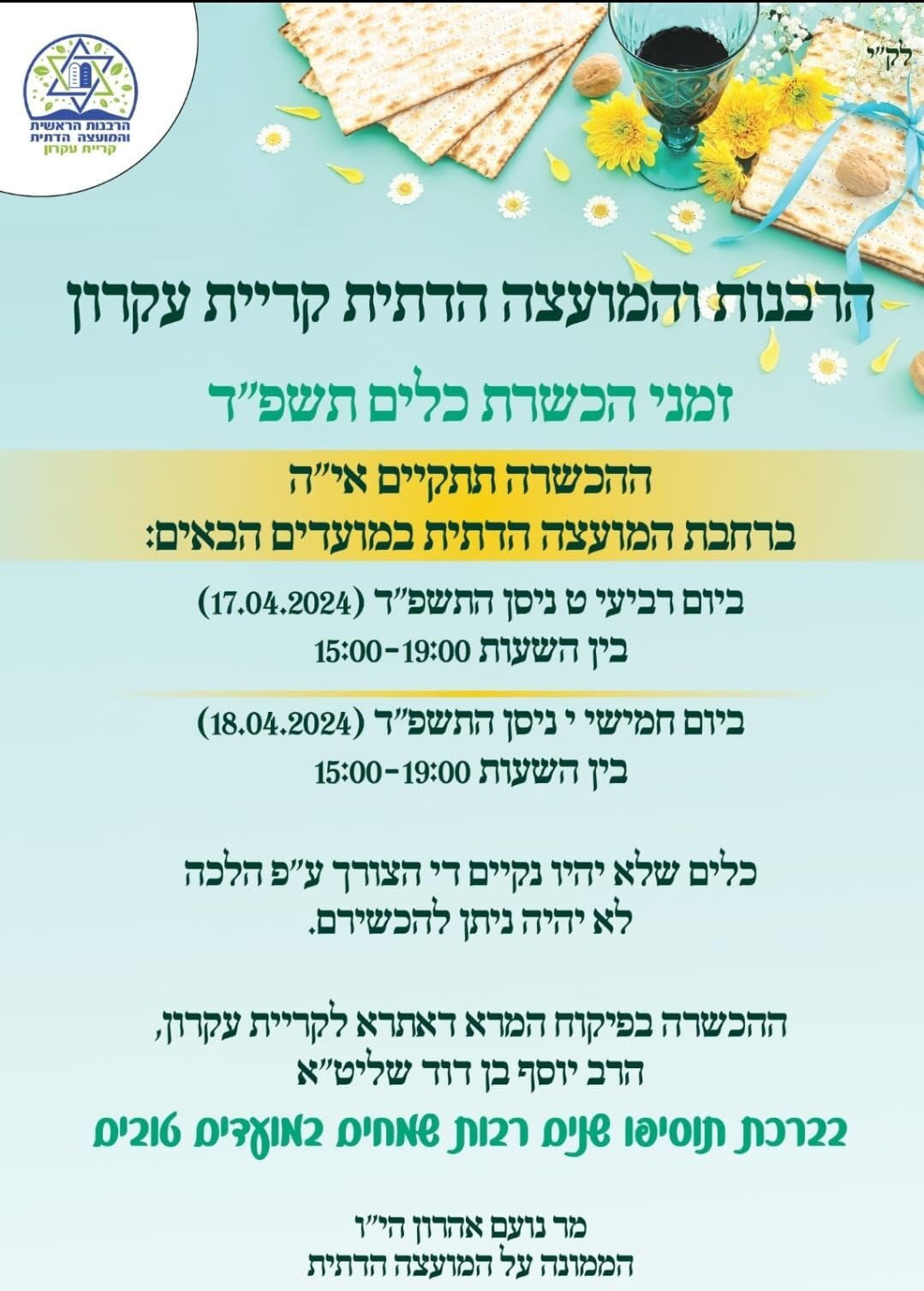 הגעלת הכלים תתקיים ברחבת המועצה הדתית בימים רביעי וחמישי 17-18.4.24 משעה 15:00 ועד 19:00