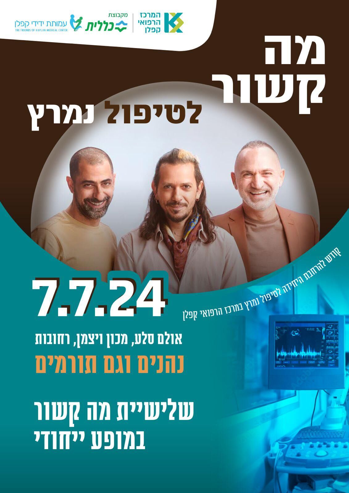מאז תחילת המלחמה, מחלקת טיפול נמרץ של המרכז הרפואי קפלן נמצאת כמעט תמיד בתפוסה מלאה, ויש צורך להרחיב את המחלקה – להוסיף עוד 4 מיטות אשפוז. חברי שלישיית "מה קשור" החליטו להירתם לטובת המשימה הקדושה, והם יופיעו בהתנדבות באירוע ייחודי, שהכנסותיו קודש להרחבת מחלקת טיפול נמרץ.