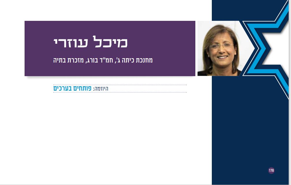 בין המורים/ות הזוכים/ות נמצאת מיכל עוזרי מחנכת כיתה ג בבית ספר בורג במזכרת בתיה. עוזרי זכתה על היוזמה פותחים בערכים