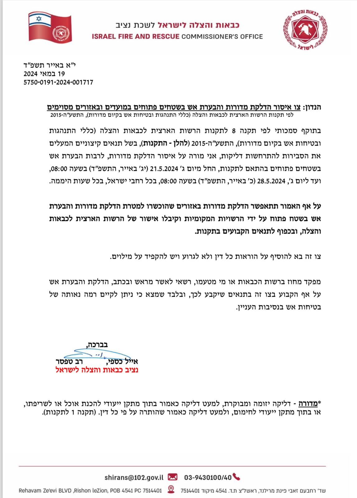 לקראת ל"ג בעומר ובעקבות תנאי מזג אוויר קיצוניים המעלים חשש להתלקחות שריפות והתפשטותן, נציב כבאות והצלה לישראל, רב טפסר אייל כספי, חתם על צו המתיר הדלקת מדורות אך ורק במקומות שהוכשרו לכך על ידי הרשות המקומית וקיבלו את אישור הכבאות.
