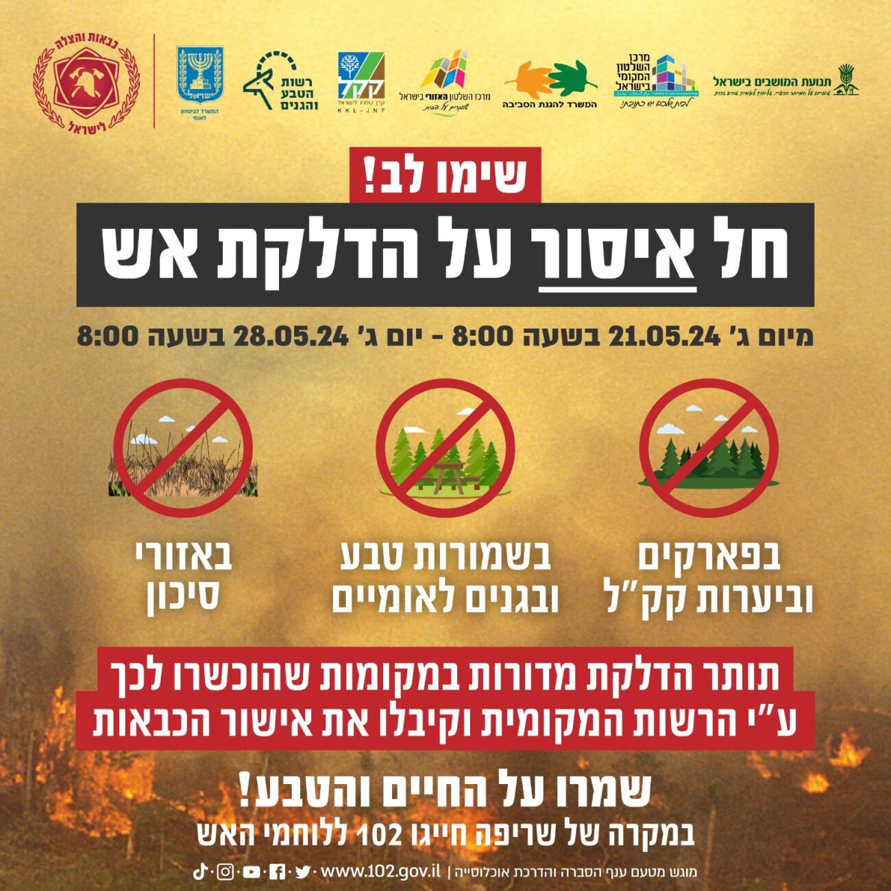 הצו כולל איסור על הדלקת אש בפארקים, יערות קק"ל ושמורות טבע. הצו יכנס לתוקף החל מיום שלישי, 21 במאי בשעה 8:00 ועד יום שלישי, 28 במאי בשעה 8:00.