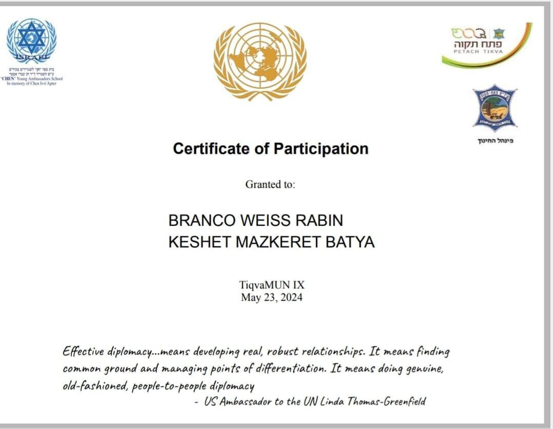 משלחת קריית החינוך ברנקו וייס השתתפה במודל האו"ם בפתח תקווה ושלושה נציגים זכו בפרסים מכובדים של "הנציג/ה הטוב/ה ביותר"