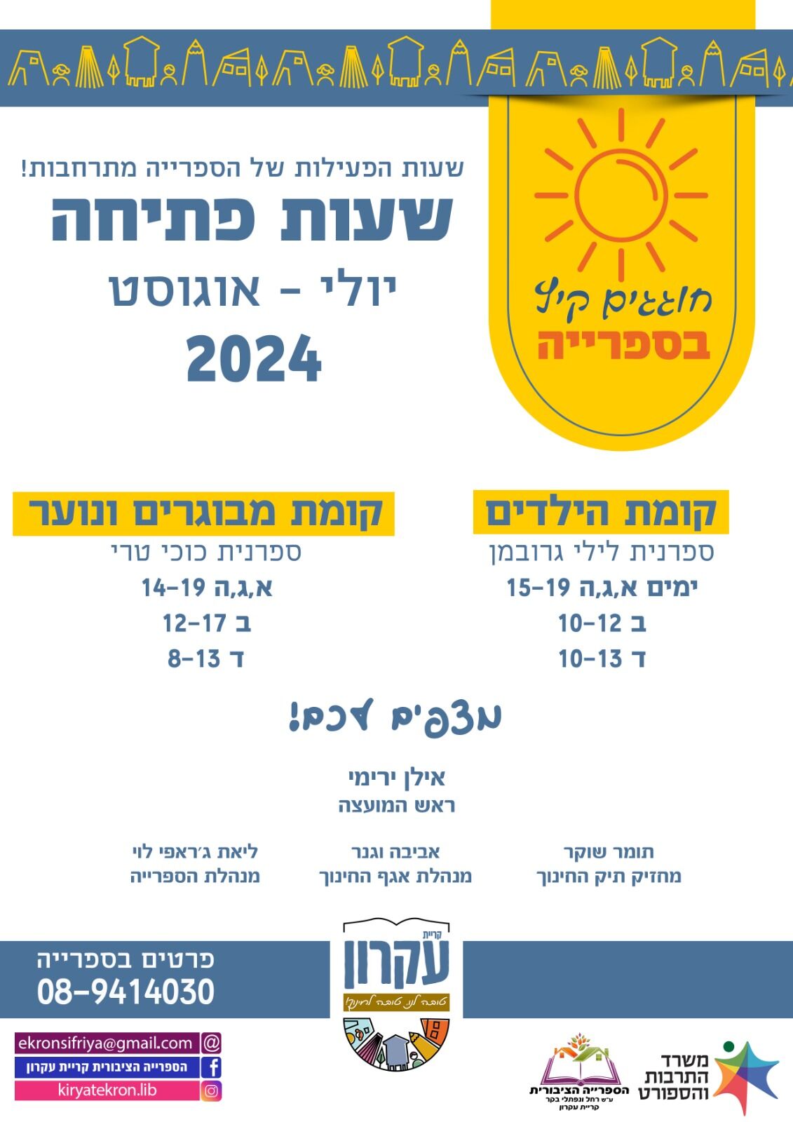 במהלך חופשת הקיץ (יולי אוגוסט) יורחבו שעות הפעילות של ספריית קריית עקרון
