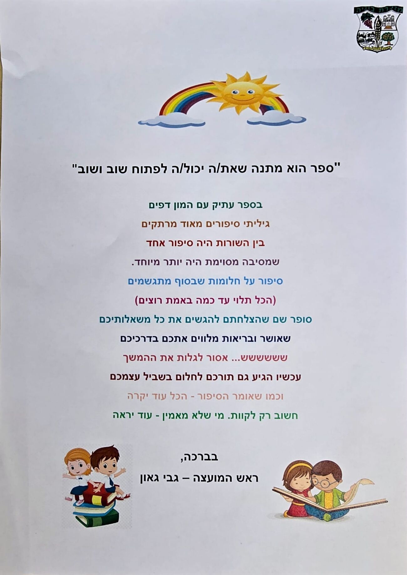 לרגל חודש הקריאה ראש המועצה, גבי גאון הגיע לביקורים מיוחדים בגני הילדים ביישוב. לרחל חג הספרים קיים גאון שעת סיפור עם הספרים האהובים עליהם. לדבריו הוא פגש ילדים נפלאים וסקרנים שיחד עם הצוותים החינוכיים הרשימו אותי במיוחד. בנוסף המועצה העניקה לכל גן אוגדן ספרים אותם יוכלו לקרוא לאורך כל השנה. גאון הודה תודה לגילה כהן מנהלת מחלקת גני הילדים במועצה על השותפות והמקצועיות.