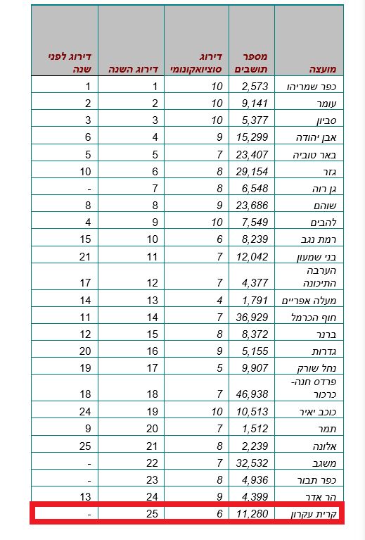 קריית עקרון נכנסה השנה לדירוג ונמצאת במקום ה25 מבין המועצות המקומיות/אזוריות בעלות יציבות פיננסית. את המקום הראשון תפסה כפר שמריהו, שני עומר ושלישי סביון