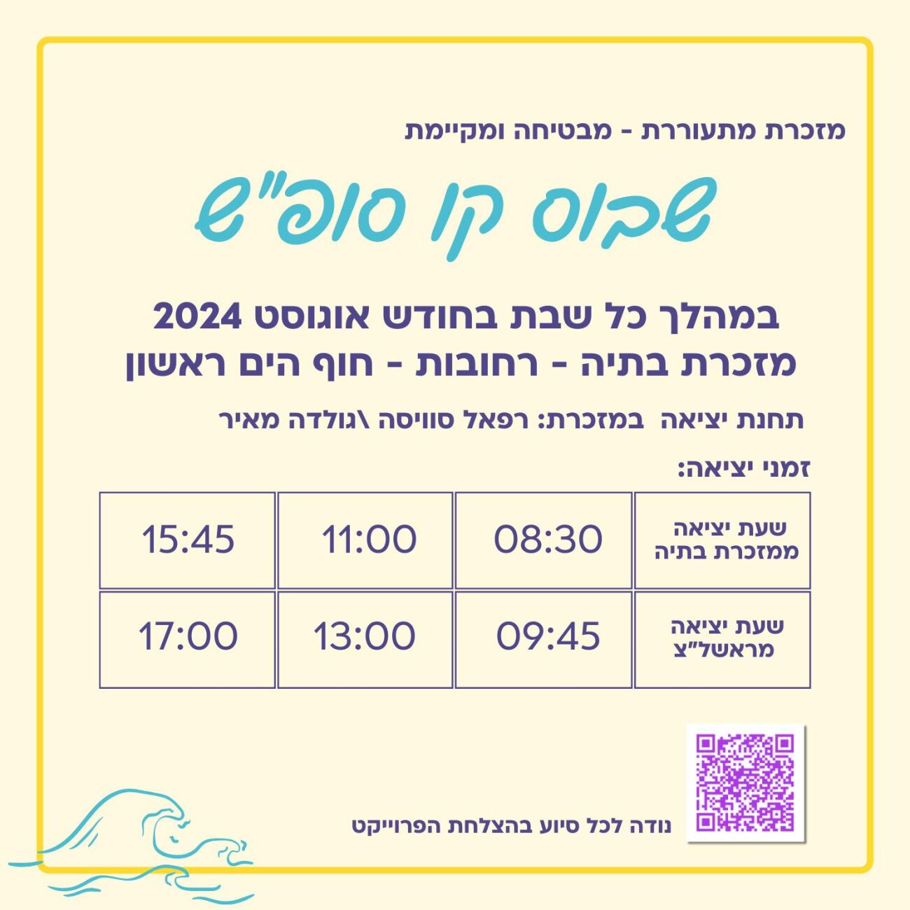 בזכות שיתוף פעולה בין סיעת מזכרת מתעוררת לשבוס ורחובות חופשית יוכלו תושבי מזכרת בתיה ליהנות מהסעה לכיוון רחובות, סינמה סיטי וחוף ראשון לציון בימי שבת לאורך חודש אוגוסט.