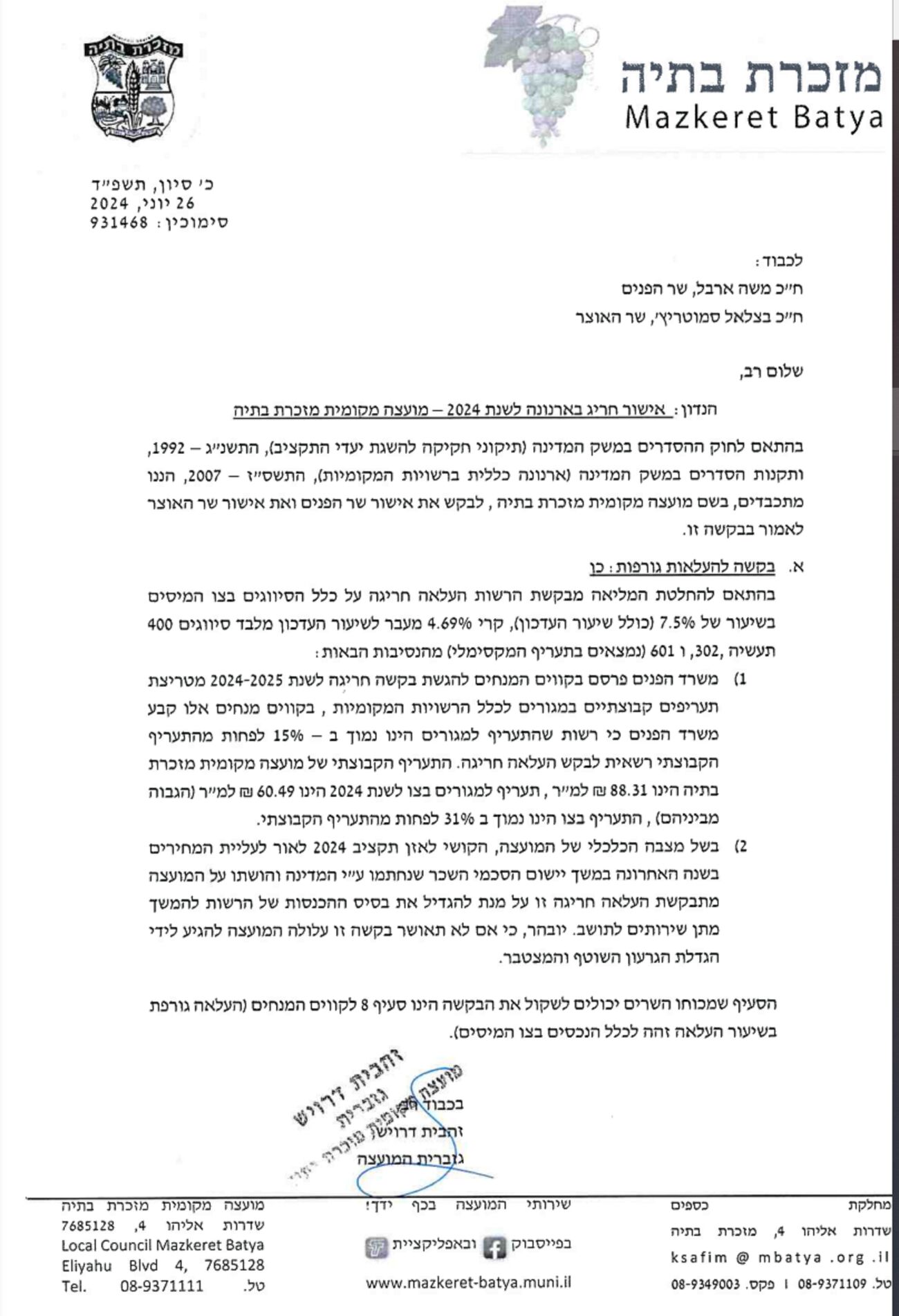 בקשת מועצת מזכרת בתיה להעלאת הארנונה
