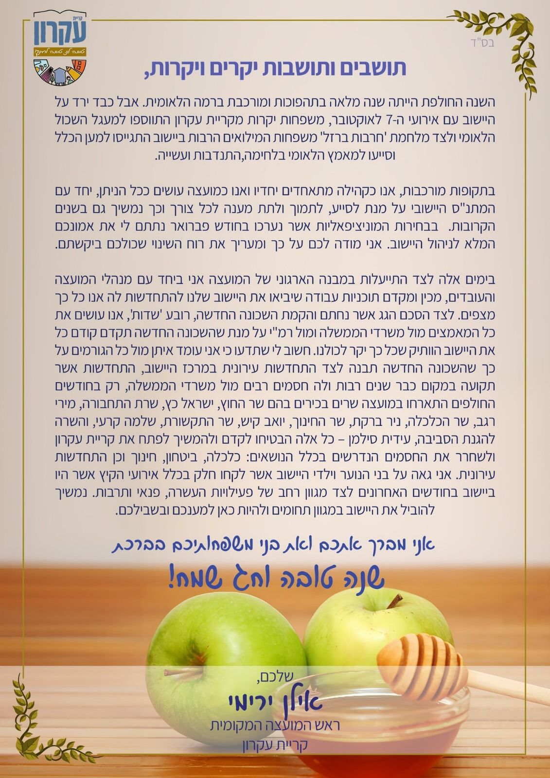 ברכת ראש המועצה, אילן ירימי לשנה החדשה