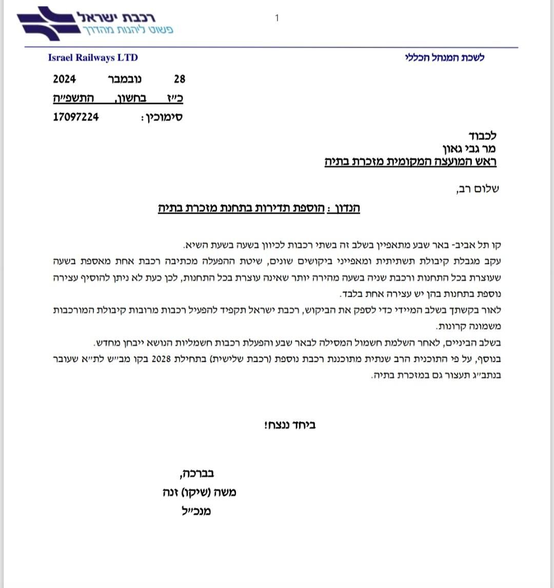 השבוע התקבלה תשובת רכבת ישראל לפנייתו של ראש המועצה, גבי גאון בנוגע לתגבור הנסיעות בתחנת מזכרת בתיה. במכתב התגובה שהגיע ממנכ"ל הרכבת נכתב כי כעת כי הנושא לא אפשרי כרגע ועל מנת לענות על העומסים הרכבת תגדיל את קיבולת הנוסעים על ידי הוספה של עוד 2 קרונות במקום 6 כיום. הסיבה לדחיית הבקשה היא כי לא ניתן לבצעה כרגע בשל מגבלות תשתית וביקוש- כיום הרכבת פועלת עם רכבת אחת מאספת שעוצרת בכל התחנות ורכבת שנייה מהירה שלא עוצרת בכל התחנות.
