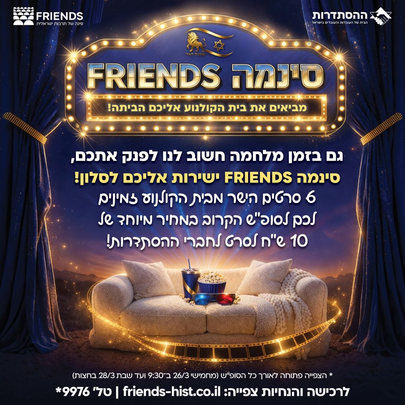 רשת מועדוני התרבות FRIENDS מבית ההסתדרות יוצאת לדרך עם מבצע צפייה ביתית מיוחד, "סינמה FRIENDS", שיתקיים במהלך סוף השבוע הקרוב. המבצע יחל ביום חמישי, 26 במרץ 2026 בשעה 09:30, ויימשך עד ליום שבת, 28 במרץ 2026 בחצות.