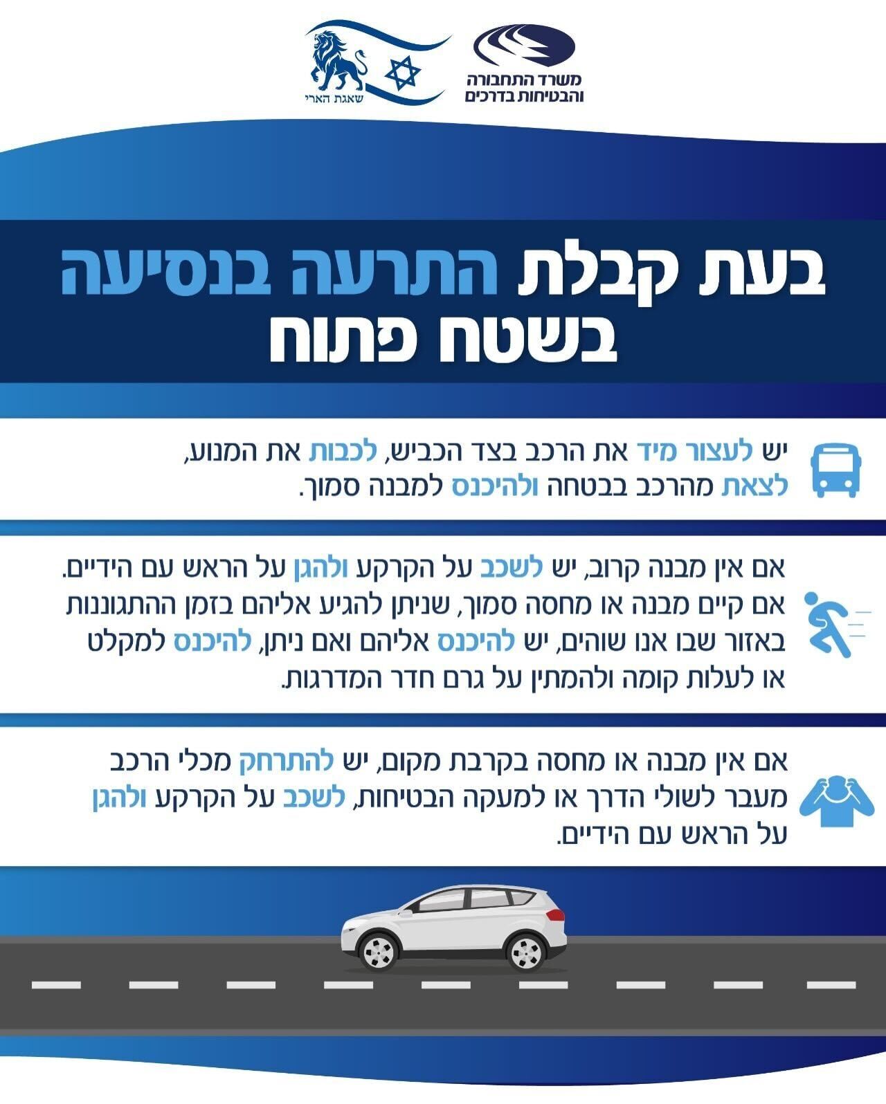 יש לעצור מיד את הרכב בצד הכביש בהקפדה על זהירות, לכבות את המנוע, לצאת מהרכב בבטחה ולהיכנס למבנה סמוך. אם אין מבנה קרוב, יש לשכב על הקרקע ולהגן על הראש עם הידיים.