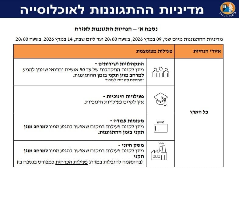 פיקוד העורף מעדכן: אין שינוי בהנחיות עד מוצאי שבת 14/3. אין לימודים, חזרה לעבודה ובתנאי שקיים מיגון, מותרת התקהלות עד 50 איש ובתנאי שקיים מרחב מוגן