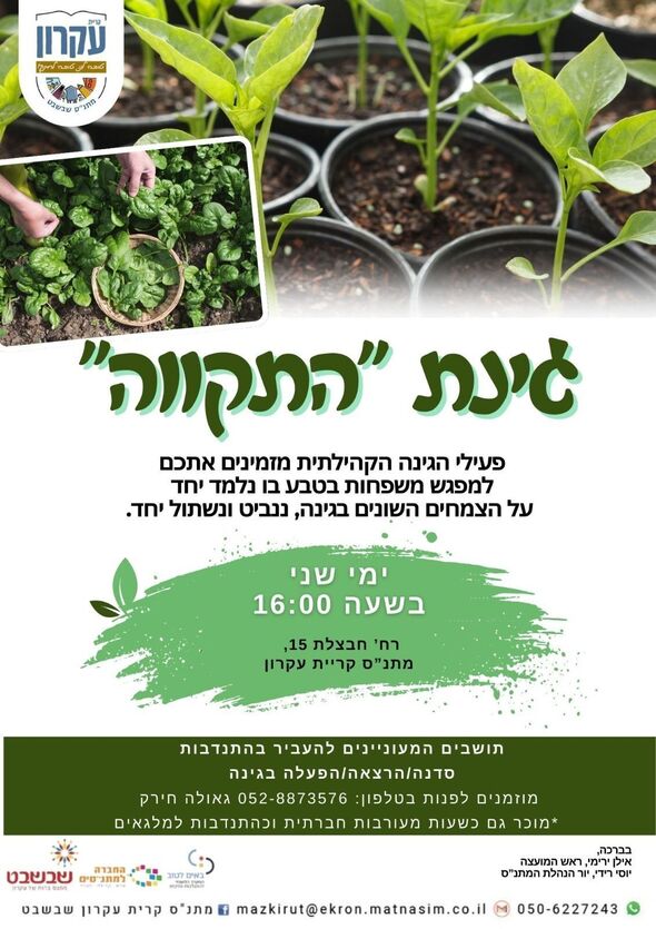 היום (שני 26.1) יתקיים מפגש קהילתי ב"גינת התקווה" במתנ"ס קריית עקרון הכולל פעילויות שתילה, הנבטה ולמידה על צמחים לכל הגילים