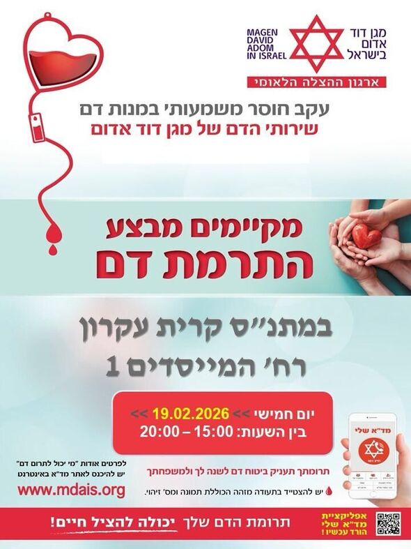 ביום חמישי, ה-19 בפברואר, יתקיים יום התרמת דם ביישוב קריית עקרון. ההתרמה תחל בשעה 15:00 ותיערך במתנ"ס "שבשבט". זוהי הזדמנות לגלות ערבות הדדית, אחריות וקהילתיות ולתרום למען האחר.