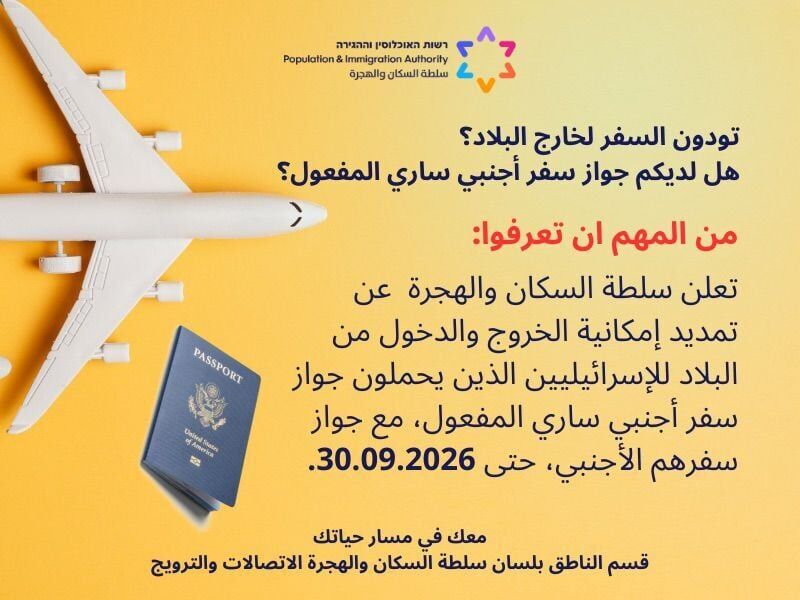 רשות האוכלוסין וההגירה הודיעה על החלטתה להאריך את התקופה בה מתאפשר לאזרחים ישראלים לצאת מישראל ולהיכנס אליה באמצעות דרכון זר.
