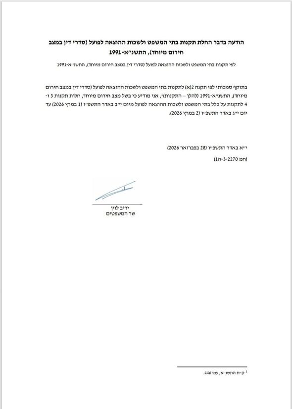 שר המשפטים חתם על תקנות להארכת מצב חירום מיוחד בלשכות ההוצאה לפועל וביחידות רשות האכיפה והגבייה עד ליום חמישי, ה-5 במרץ 2026, וזאת בעקבות מבצע "שאגת הארי".