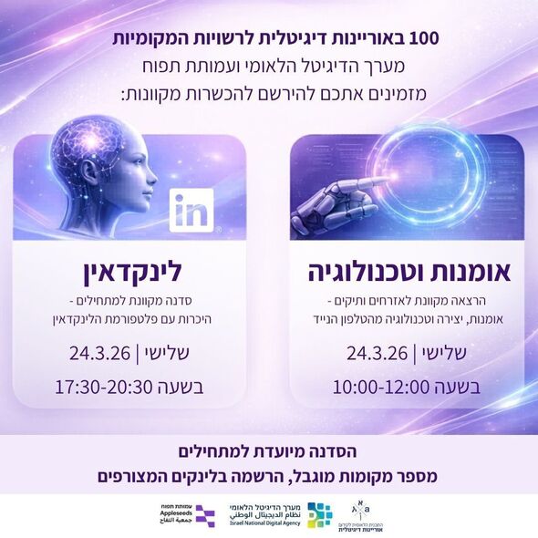 לינקדאין למתחילים: סדנה מעשית שבה המשתתפים יתנסו ביצירת פרופיל, בניית רשת קשרים ושימוש נכון בפלטפורמה למטרות קידום תעסוקתי. הסדנה תתקיים בין השעות 17:30 ל-20:30. להרשמה מראש לסדנה לחצו כאן.