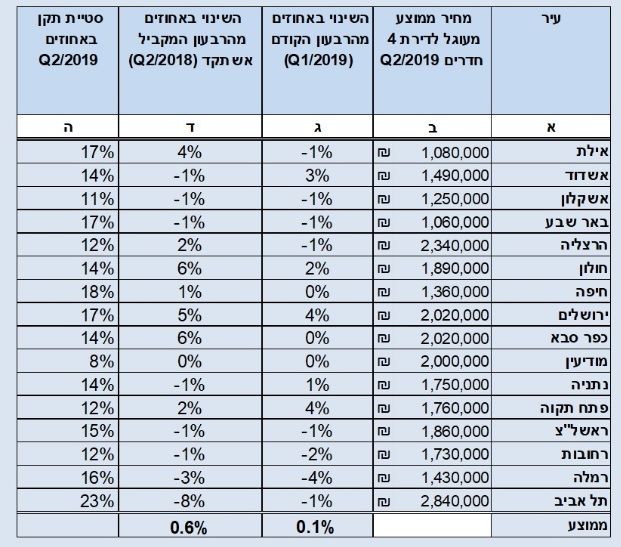 בראייה כללית ברבעון השני של שנת 2019 (אפריל – יוני) יש עלייה כללית של 0.1% במחיר הממוצע של דירות 4 חד'.