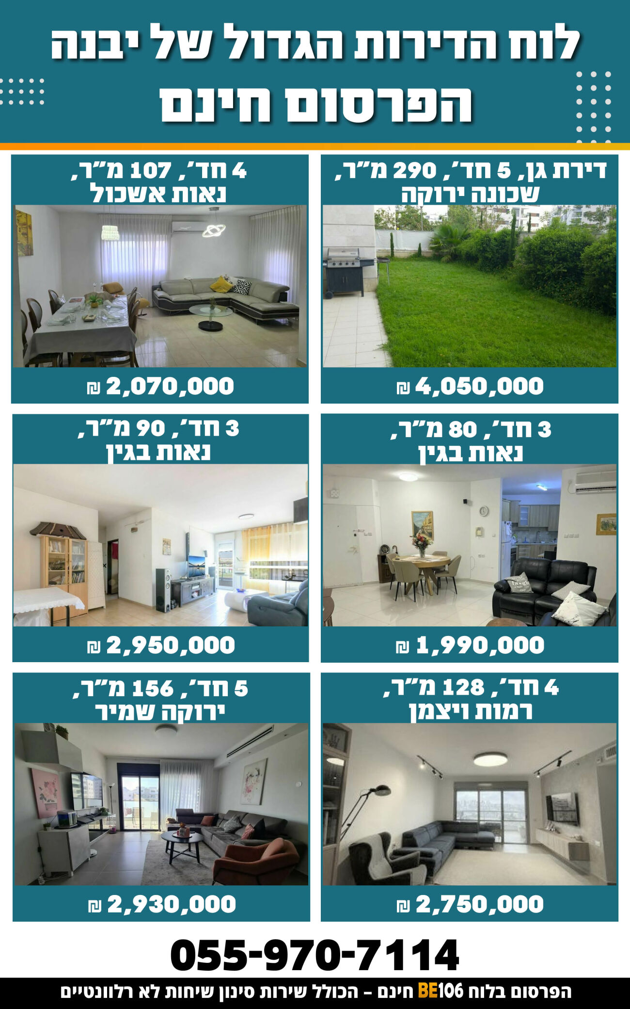 לוח הדירות הגדול של be106 יבנה מופץ גם בראשון לציון, רחובות, בת ים, חולון, גדרה, קרית עקרון ומזכרת בתיה