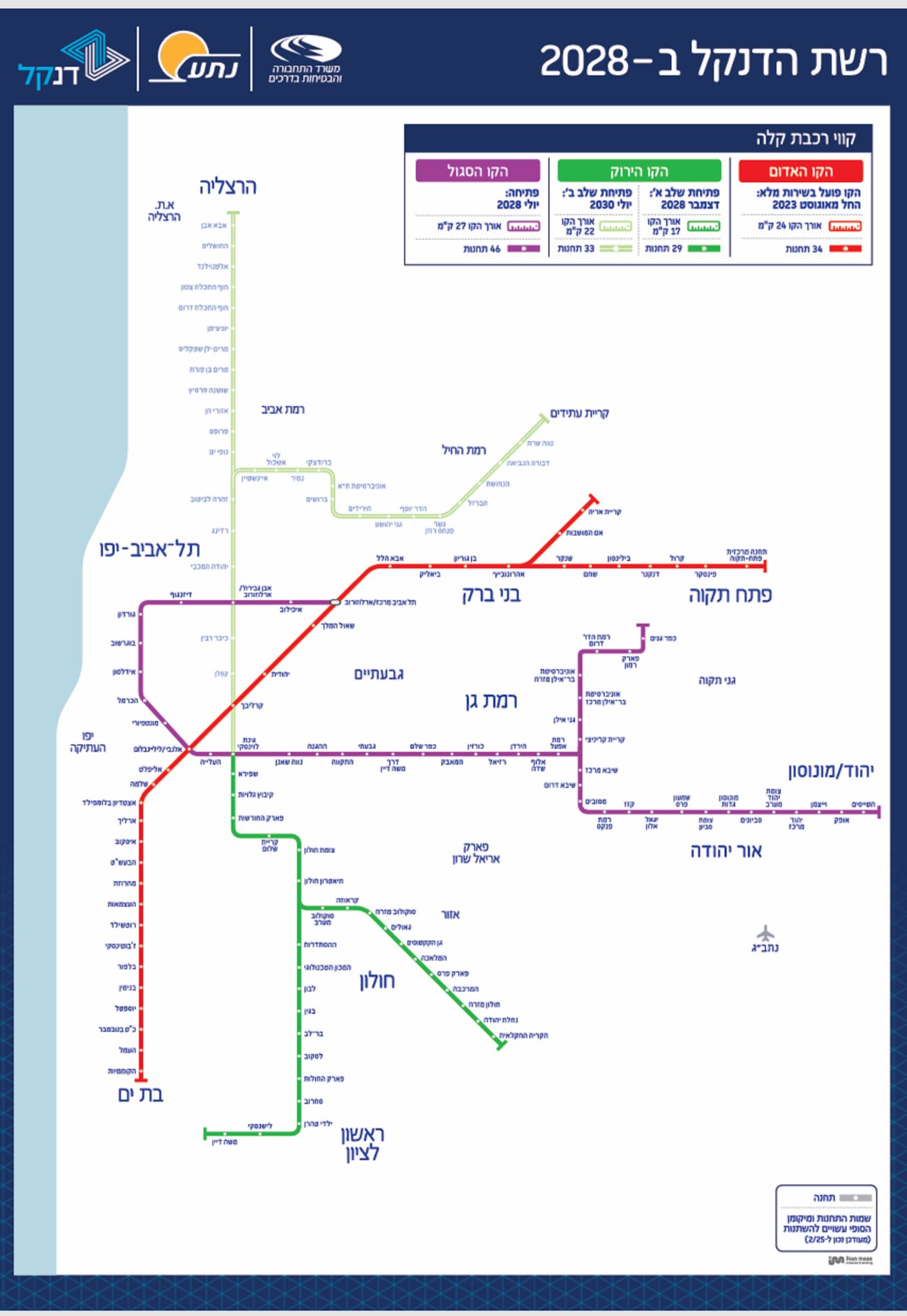 הקו הסגול, העובר בשטחן של שמונה רשויות מקומיות: תל אביב, גבעתיים, רמת גן, גבעת שמואל, קריית אונו, אור יהודה, יהוד–מונסון וחבל מודיעין, וכולל 46 תחנות. עם השלמתו, הקו צפוי להוביל כ-256 אלף נוסעים ביום, בתדירות שיא של 4 דקות, ובסך הכל מעל 60 מיליון נוסעים בשנה. בתל אביב יעבור הקו ברחובות אלנבי, בן יהודה וארלוזורוב, בהן מתקדמות בימים אלה עבודות לקראת הנחת המסילה.