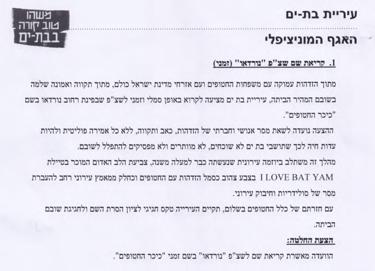 לציון 700 ימים לפרוץ המלחמה, אישרה מועצת עיריית בת ים את קריאת רחבת המזח שמול רחוב נורדאו בשם הזמני "כיכר החטופים".